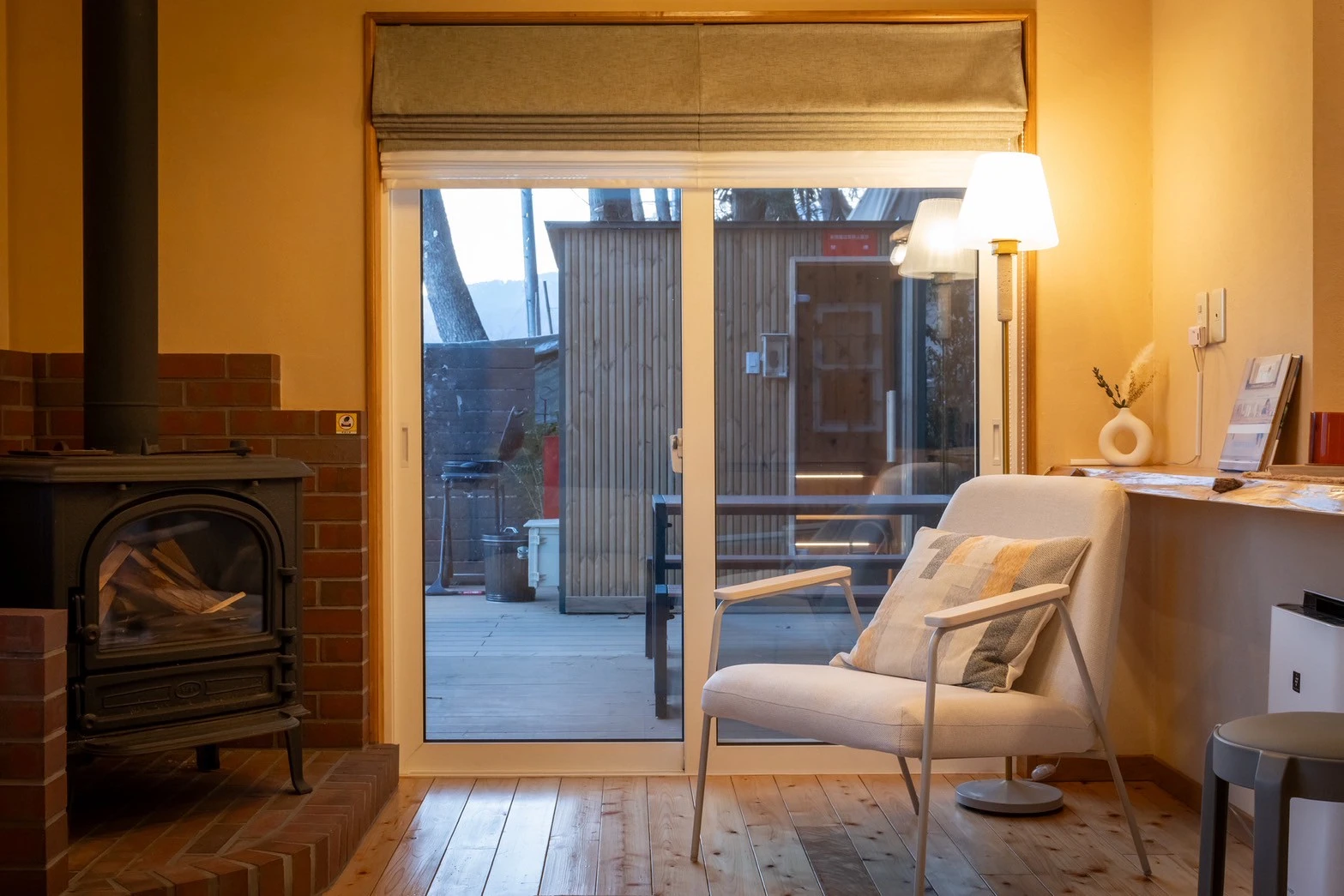 自然と調和する素材選びと、滞在者がくつろげる空間づくりを追求。山の景観を室内に取り込みながら、穏やかな時間が流れる空間を演出しています。